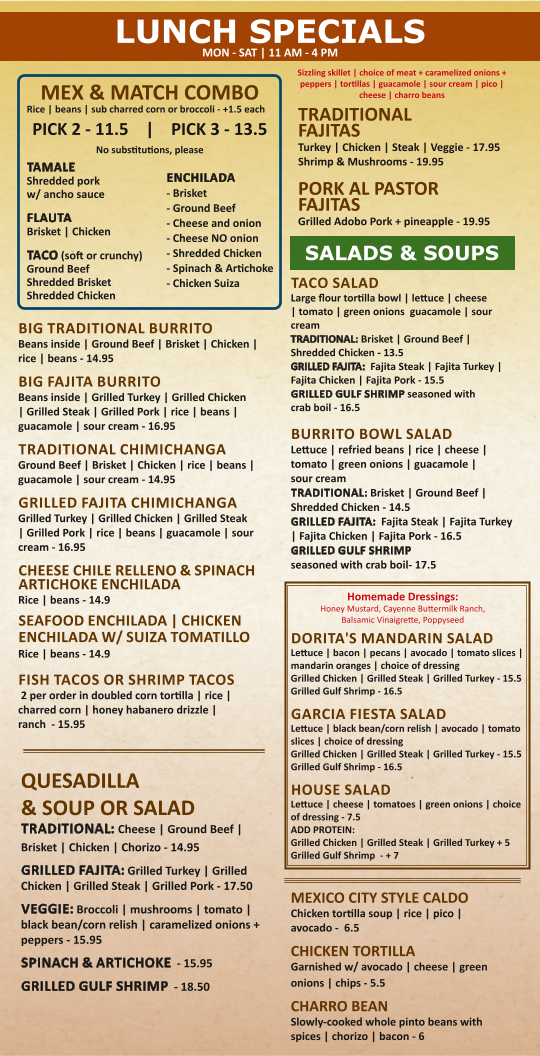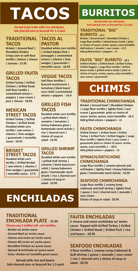 Lettuce, refried beans, rice, cheese, tomato, green onions, guacamole, and sour cream • Traditional: Brisket Ground Beef Shredded Chicken • Grilled Fajita: Fajita Steak Fajita Turkey Fajita Chicken Fajita Pork • Grilled Gulf Shrimp: seasoned with crab boil