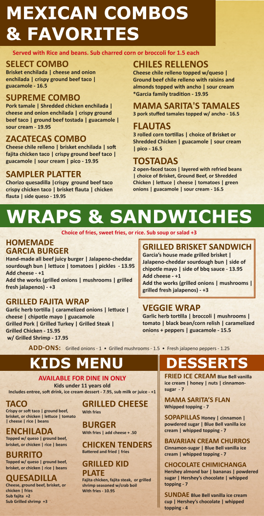 Kids are not forgotten, with a dedicated menu including Quesadillas and crispy Tacos. Each dish is prepared with love and quality ingredients, garnering rave reviews from customers. Whether you're stopping by for a quick lunch or a family dinner, Garcia's invites you to enjoy unforgettable flavors and create lasting memories.